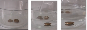 EJECUCIÓN: Tesla dice a los niños/as que con ayuda del agua vamos a hacer desaparecer una moneda. Se les entrega a los niños/as unos contenedores con monedas y les indicamos que cojan una y la coloquen en el fondo del recipiente. A Continuación, les indicamos que añadan agua, que se agachen y miren a través de las paredes de tarro y nos cuente lo que ven. La contestación es que ven la moneda que se ha hecho grande, porque el agua hace que las cosas sean grandes, porque es una lupa.(Con antelación hemos trabajado el efecto lupa del agua, de ahí que lo sepan),Ahora, les decimos que saquen la moneda y vacíen los vasos en el contenedor del agua. Les indicamos que vuelvan a llenar los vasos con agua y que se agachen otra vez para mirar a través de las paredes del vaso. Ahora la moneda ha desaparecido. Si se levantan y miran por la boca del vaso, la moneda está ahí, pero al agacharse no está. Preguntamos si saben por qué pasa eso. Es magia, dice uno de los niño/as. No, no es magia, dice la marioneta. Es la luz.Les explicamos que el agua no deja que pasen los rayos de luz, y hace que reboten como las pelotas.Esto que ocurre tiene un nombre científico y es refracción de la luz que es otra propiedad del agua.Recordamos la que conocemos: que el agua funciona como una lupa y hace las cosas grandes y esta nueva, que hace que la luz rebote y se llama refracción. Les dejamos experimentar libremente añadiendo más monedas dentro, debajo, combinando dentro y fuera, etc.