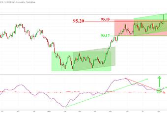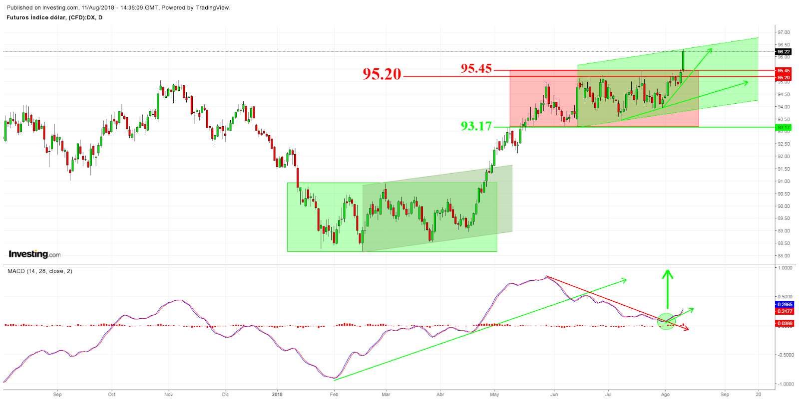 "Igual un ataque y perforación de dicho techo (95.45) en cierre de velas diarias podría indicar que el "proceso de reflexión" en el DX ha terminado y que la senda alcista de Medio/Largo Plazos continúa... Como elemento favorable a los alcistas del DX está el canalillo y aceleración alcistas dentro de este movimiento lateral a partir del 14/06/2018..."