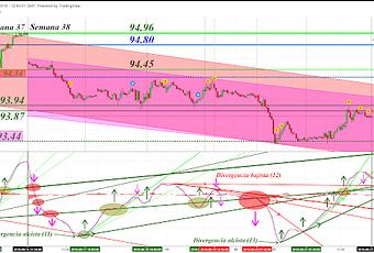 donde se hace especial énfasis en los objetivos y alcance de estos análisis técnicos sobre el Index Dollar que publico en este blog:---En el informe técnico correspondiente al cierre de la Semana 37/2018 decía (cita textual): "Durante la Semana 38/2018 debe tenerse en cuenta:-La expectativa, no menos viable, de una nueva corrección bajista al menos para desacelerar la recuperación alcista de las últimas horas de la Semana 37/2018 ya que el reflejo de la acción del precio en el Oscilador MACD es demasiado vertical...-La expectativa, aún viable, de que se marque un nuevo mínimo bajo el actual nivel de Soporte situado en 94.34 lo cual indicaría una potencial mayor profundización de la corrección bajista en el horizonte temporal de Corto/Medio Plazos...-Los papeles protagónicos de los niveles 94.45, 94.80, 94.96, 95.20 y 95.45se mantienen en la misma expectativa de intercambiar sus papeles de Resistencias a Soportes y viceversa... "Bien, en la apertura de la Semana 38/2018 la acción del precio del DX efectúa un Gap bajista y se sitúa, casi de un tirón, sobre uno de los Soportes referencia: nivel 94.45; a continuación, pierde este Soporte y se apoya, aunque brevemente, sobre el muy importante (para esta etapa) Soporte referencia situado en el nivel 94.34 el cual, una vez perdido y como ya se pronosticó más arriba, da paso a una profundización de la corrección bajista en ciernes que viene experimentando el DX; aparecen entonces "nuevos actores" en el escenario de la Semana 38/2018, son los Soportes 93.94 y 93.87 correspondientes al Horizonte Temporal de Medio Plazo; la franja entre ellos sirve de Soporte a la acción del precio en varios intentos por recuperar el antiguo Soporte, para entonces Resistencia, situado en el Actual Nivel Referencia 94.34; debe destacarse que los impulsos alcistas que llevaron de nuevo la acción del precio hasta esta Resistencia nivel 94.34 fueron posibles gracias a la formación de la Divergencia alcista (11) en el Oscilador MACD; sin embargo, el intento de recuperar el nivel 94.34 como Soporte fracasa y se profundiza aún más la corrección bajista en ciernes a partir de la formación, en el Oscilador MACD, de la Divergencia bajista (12) como consecuencia de lo cual la acción del precio pierde el apoyo de la franja Soporte entre los niveles 93.94 y 93.87, continúa su trayectoria bajista y se detiene sobre un "nuevo" nivel se Soporte situado en 93.44 a partir del cual se forma, en el Oscilador MACD, una nueva Divergencia alcista (13) gracias a la cual comienzan los intentos de recuperación de la anterior franja/Soporte niveles 93.94 y 93.87... Debe destacarse que este nivel de Soporte situado en 93.44 también se ha formado anteriormente en el Horizonte Temporal de Medio Plazo... Actualmente, el reflejo de la acción del precio del DX en el Oscilador MACD se encuentra situado sobre las Directrices proyecciones de las Divergencias alcistas (10), (11) y (13)...Conclusiones: 1-La Tendencia Principal de Corto Plazo del DX es BAJISTA (Después de todo, una tendencia bajista está formada por una sucesión de máximos y mínimos decrecientes.)2-Si se marca un nuevo Mínimo bajo el Nivel 93.44, la profundización de la corrección bajista de la acción del precio en el DX continuará...