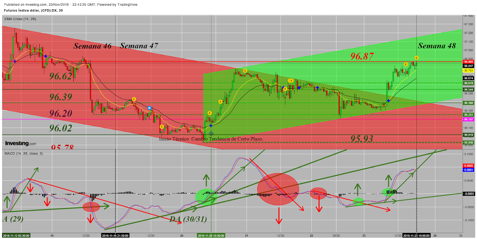 En el informe técnico del Cierre DX, Semana 46/2018 https://crowcurrencies.blogspot.com/2018/11/cierre-tecnico-dollar-index-dx-semana_17.htmldecía (cita textual):" Como se puede apreciar en el Chart DX, Velas Japonesas de 30 Minutos, la acción del precio del DX se encuentra, al Cierre de la Semana 46/2018, en el Suelo de un Canal Bajista; el reflejo de la acción del precio en el Oscilador MACD, por su parte, se encuentra bajo la Directriz/base de la Divergencia Alcista (29)... La Tendencia de Corto Plazo es, por tanto, Bajista mientras no de señales claras de cambio... "--- 1- El movimiento de la acción del precio del DX, durante la apertura de la Semana 47/2018 y los días posteriores, estuvo definido por la continuidad Bajista; en cuanto al Reflejo Técnico Gráfico, se registraron varios Mínimos Semanales hasta llegar al Suelo de la Caída en el Nivel 95.93... La acumulación de Sobreventas se manifiesta, en cuanto al reflejo de la acción del precio en el Oscilador MACD, en la formación consecutiva de 2 Divergencias Alcistas (30/31) queterminaron por influenciar de forma decisiva el inicio técnico del cambio de tendencia de corto plazo...:2- Inicio Técnico de la Subida...:- 20/11/2018 10:30 Horas (UTC)... Nivel Inicio Técnico de Subida: 96.170...-Reflejo Técnico Gráfico: Posterior perforación del Techo el Canal Bajista y construcción de un Patrón de Cambio de Tendencia en Canal de Bajista a Alcista... Reconquista Alcista consecutiva de los entonces Niveles de Resistencia:96.02, 96.20 , 96.39 y96.62 ... Resistencia a Continuidad de Subida/Potencial Recuperación: Entorno Nivel96.87...-Reflejo en el Oscilador MACD: Pérdida posterior tanto de la Directriz/aceleración como de la Directriz/base de lasDivergencias Alcistas (30/31)... pero, como "contraparte Alcista": recuperación "final", Enérgica y Sostenida, del Nivel "0" del Oscilador...Resumen: La acción del precio del DX termina la Semana 47/2018 dentro de un Canal Alcista aunque bajo la Resistencia Nivel 96.87 que fue el anterior Máximo Anual... La Tendencia de Corto Plazo es, por tanto, Alcista mientras no de señales claras de cambio... Chart DX, Velas Japonesas de 30 Minutos: