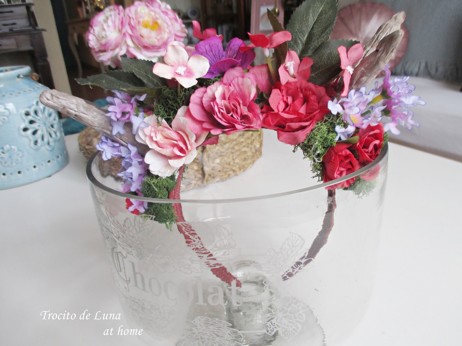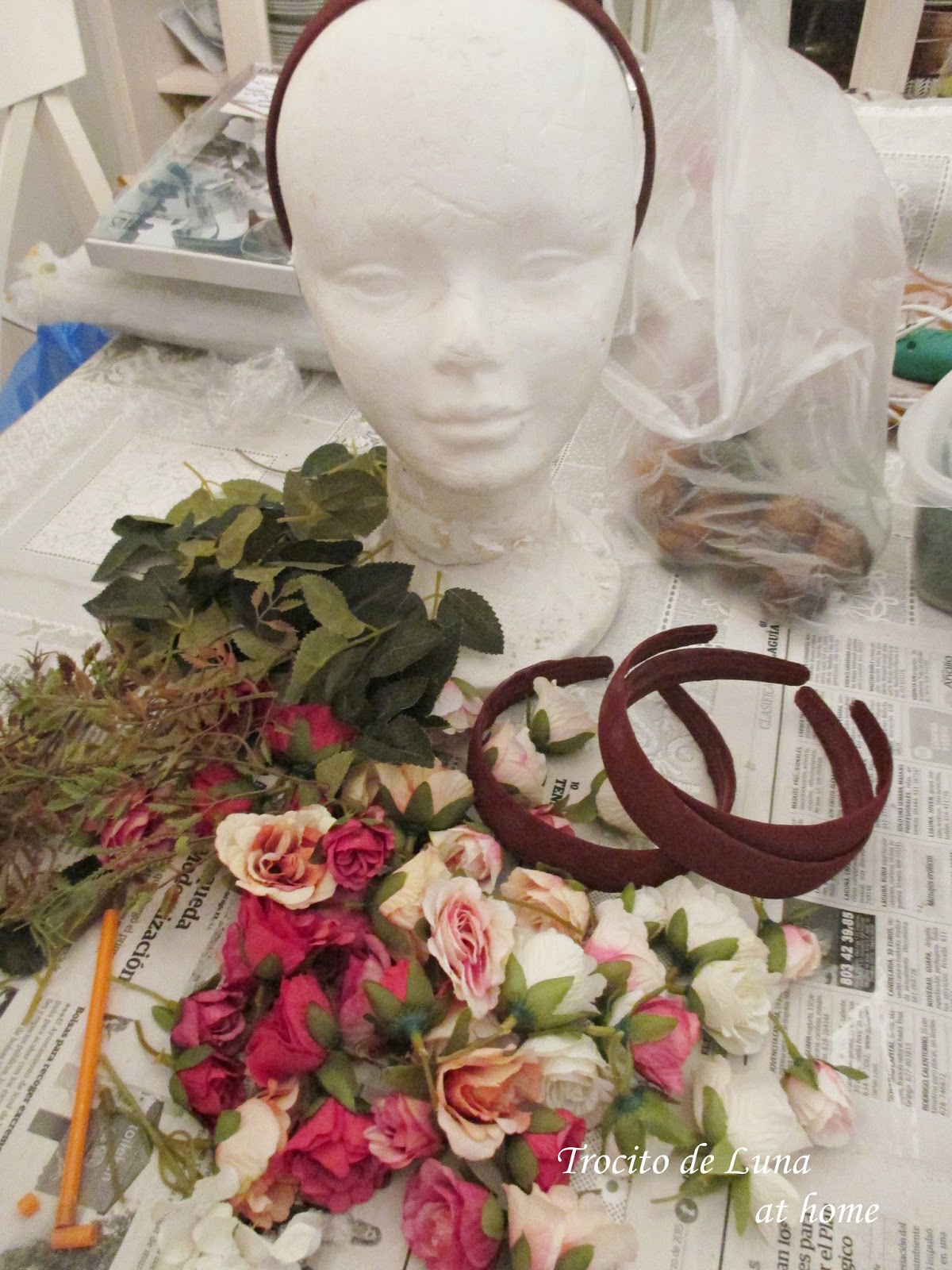 Una vez pegados los cuernos a la diadema con silicona, fuí intercalando flores, musgo, algunas hojas...Y así quedaron!!