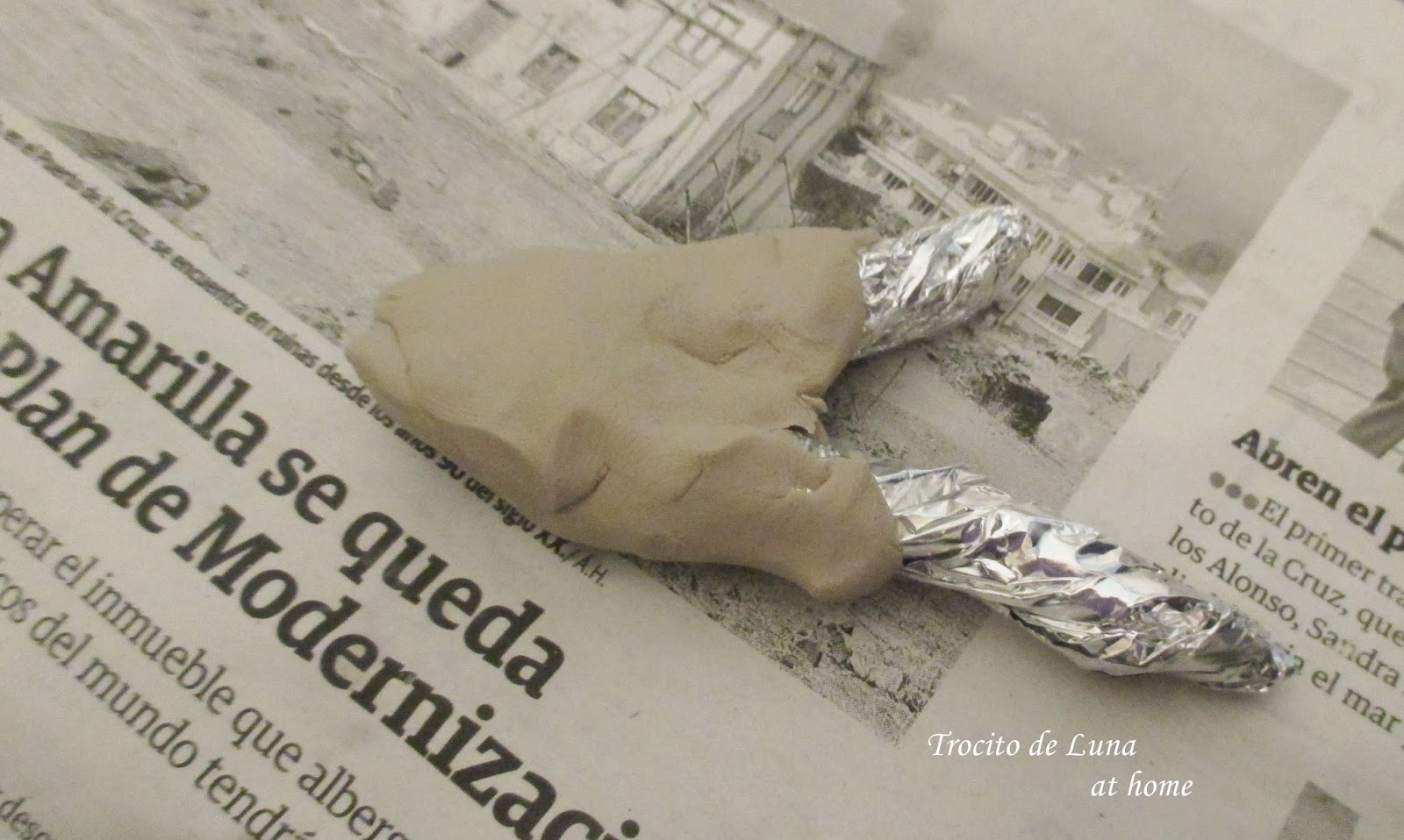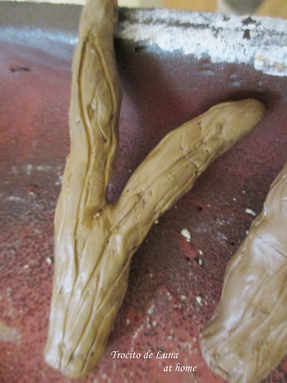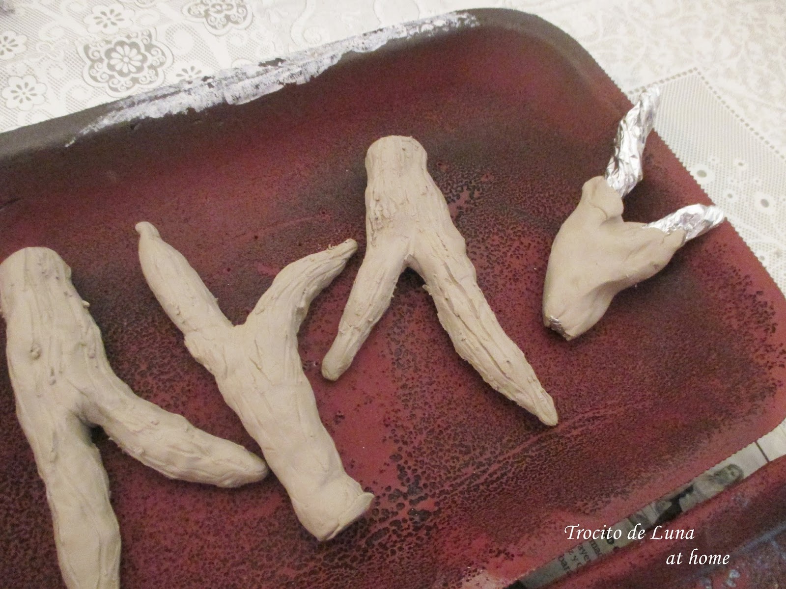 Los cuernitos los hice a partir de papel de aluminio dándoles forma de cuernos que más tarde serían modelados con pasta y les hice unas rayas con un tenedor chiquito para darles más realismo.
