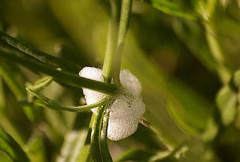 La espuma que rodea a las ninfas las protege de la desecación y también les da un cierto grado de protección frente a los depredadores (aunque luego aparece el que suscribe con su cámara de fotos y un palito y nos las deja en paz).Esta espuma es producida por la propia ninfa haciendo entrar aire en la masa de fluido exudado por el ano.