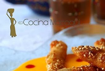 Sacamos la semilla a los dátiles, los escaldamos afin de poder quitarles la piel –solo escaldados-, trituramos las almendras.Hacemos una masa con la carne de los dátiles, las almendras y el azúcar.Amalgamamos, añadiendo agua de azahar hasta que nos quede una masa parecida almazapán. Añadimos la canela. Cortamos rectángulos de pasta filo. Hacemos unaespecie de canalón, no muy grueso, del tamaño de un cigarro, enrollamoscerrando los extremos. Horneamos hasta que queden dorados. Barnizamos con lamiel y añadimos las semillas de sésamo. Reservamos.