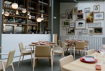 De este modo, el campo, la artesanía, la luz y la materia prima inspiraron las tres plantas del local. En la planta baja, el techo flotante de madera con textura de bellotas filtra la luz como lo percibiríamos si sesteáramos bajo un alcornoque. Un “museo colgante” con las mejores piezas de jamón Cinco Jotas enmarca el trabajo del cortador, que prepara sin parar platos y platos, de esos que te encantaría pellizcar.