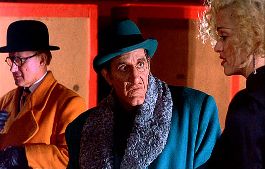 A mi no me molesta en demasia que Madonna como Breathless tenga mucha participación, ya se que la actuación no es lo de ella pero la música si y lo demuestra en esos números musicales que en lo personla disfrute bastante, por lo demás no sale mucho más que como femme fatale que no deja mucho a la imaginación y tampoco me quejo por ello (¿Cómo podría?), del resto del reparto solo pueden decirse elogios, no es que se luzcan mucho, varios no tienen ni tiempo pero es una plantilla que cualquier director y productor tomarían como si se hubieran sacado la lotería, Al Pacino, Dustin Hoffman, James Caan, Paul Sorvino y un largo etc., algunos irreconocibles entre tanto maquillaje que los convierte en esos maleantes deformes del mundo de Chester Gould.