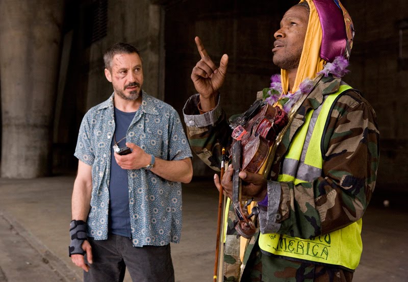 EL SOLISTA (THE SOLOIST, REINO UNIDO - EU, 2009) Empece a ver esta cinta con unas expectativas altisimas debido a que Joe Wright se ha convertido en uno de mis directores favoritos debido a la excelente "Orgullo y Prejuicio" y despues a la magnifica "Expiación, Deseo y Pecado" que son algunas de las mejores peliculas de los últimos años, claro que uno piensa que en Hollywood Wright tendrá mayor libetad monetaria y por lo tanto de tiempo pero tambien queda claro que los directores tienen menos libertades politicamente hablando, y es que el tono sombrio de las obras de Wright no se ve en esta cinta, solo esbozos de su talento que no logran salvar la pelicula o por lo menos no como uno hubiera deseado.Y de que va? El periodista Steve Lopez (Robert Downey Jr. bien) encuentra a Nathaniel Ayers (Jamie Foxx) en la calle y reconociendo una buena historia decide investigarlo, despues de descubrir el talento que tiene Nathaniel para la musica y el interes de los lectores por este decide llevar las cosas más lejos e intentar salvarlo, no solo de vivir en la calle sino de su esquizofrenia pero despues se arrepiente de usarlo y al ver que tampoco puede ayudarlo decide hacer lo único que puede hacer, ser su amigo, sniff. La trama no esta mal y es de agradecer que Wright no tome el sendero facil de hacer una lacrimogena cinta chantajista pero creo que al nivel de las historias que tomaba el director esta queda cortisima, las otras cintas estaban basadas en libros que ya son clasicos y esta en un libro escrito por un periodista que además no puede ser más politicamente correcto o sencillo tanto en su narrativa como en su composición.