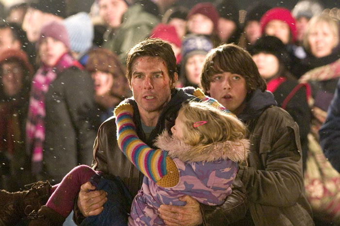 Por supuesto que hay otra lectura, más alla de la recurrente familia disfuncional y quebrada del cine de Spielberg, esta es sobre el peligro que tiene para los norteamericanos un posible ataque e invasión por parte de algún enemigo que inclusive puede ser desconocido como en este caso, y es ahi donde radica gran parte del ingenio Spielbergniano, el director es tan inteligente que ni siquiera especifica de donde son los enemigos (en el libro y la cinta original son marcianos), y de hecho estos ya tenian preparado el ataque desde muchisimo tiempo antes con armas en su propia casa(lo cual rompe la logica de la trama pero bueno), es obvio que Spielberg quiere jugar con el miedo de los norteamericanos al terrorismo en plena época de paranoia, el enemigo puede ser cualquiera y llegar de cualquier parte, invadirlos y derrotarlos facilmente y su unica esperanza es la ayuda de Dios al pueblo "elegido" como en la cinta del cincuenta y tres. La cinta inicia mostrandonos al pedante, engreido e irresponsable Ray (Tom Cruise, perfecto) que recibe la visita de sus hijos, por un lado su hijo Robbie (Justin Chatwin) quien se enfrenta a él cada vez que puede y por el otro su hija Rachel (Dakota Fanning, muy bien) quien simplemente no le tiene confianza y a quien Ray no conoce ni tantito.Asi que desde el inicio con los altercados con sus hijos, su ex esposa (Miranda Otto)