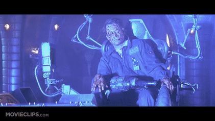 LA NAVE DEL TERROR (EVENT HORIZONT, REINO UNIDO - EU, 1997)El Dr. William Weir (Sam Neill, robandose el show) tiene una vivida pesadilla sobre su esposa, ella lo seduce y despues se muestra sin ojos, inesperadamente el tono de la cinta cambia y se vuelve siniestro, y nos muestra perfectamente cual sera el tono de la cinta, comenzando como una película de ciencia ficción donde la nave "Lewis and Clark" sera enviada cerca de Neptuno en una misión secreta que solo conoce el mismo Weir, en la nave el Dr. no es bien recibido, ni siquiera por el capitán Miller (Laurence Fishburne) que lo ve como un intruso, y lo verán todavía peor cuando suelte que estan ahí para recuperar la nave "Event Horizont" que desapareció hace siete años pero que hace poco apareció de la nada y mando señales, es muy valiosa porque viaja mas rápida que la velocidad de la luz no superándola sino "doblando" la realidad, es decir la nave había viajado a otro punto del espacio, y él esta ahí porque es el diseñador de la nave.