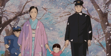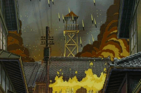 Pero esto no es asi para Seita que siempre soporta con orgullo los horrores de la guerra, con la esperanza de la victoria y su gorra en alto, creo que aquí Takahata también critica su sociedad que se rindió sin honor, que recibió a los norteamericanos con gusto casi prostituyéndose y que algunos hasta tomaron la derrota como burla como en esa afrentosa escena de un detestable tipo sonriente al decir que todos los marinos estan en el fondo del mar. Y por supuesto como Takahata lo vivió, y lo vio, el mundo no puede ser mas real, la animación nos lleva a ese terrible mundo y los trazos nos trasportan a la psique de una población que veía horrores sin fin, esos fondos con los pueblos destruidos, ese cielo negro, los cuerpos aquí y alla, los quemados cubiertos de vendas y atacados por gusanos, todo es tan realista que duele pero tan artístico que nos sorprende gratamente, en cuanto al sonido es impresionante, terminamos agachando la cabeza al escuchar ese pitido de los bombarderos que se acercan.
