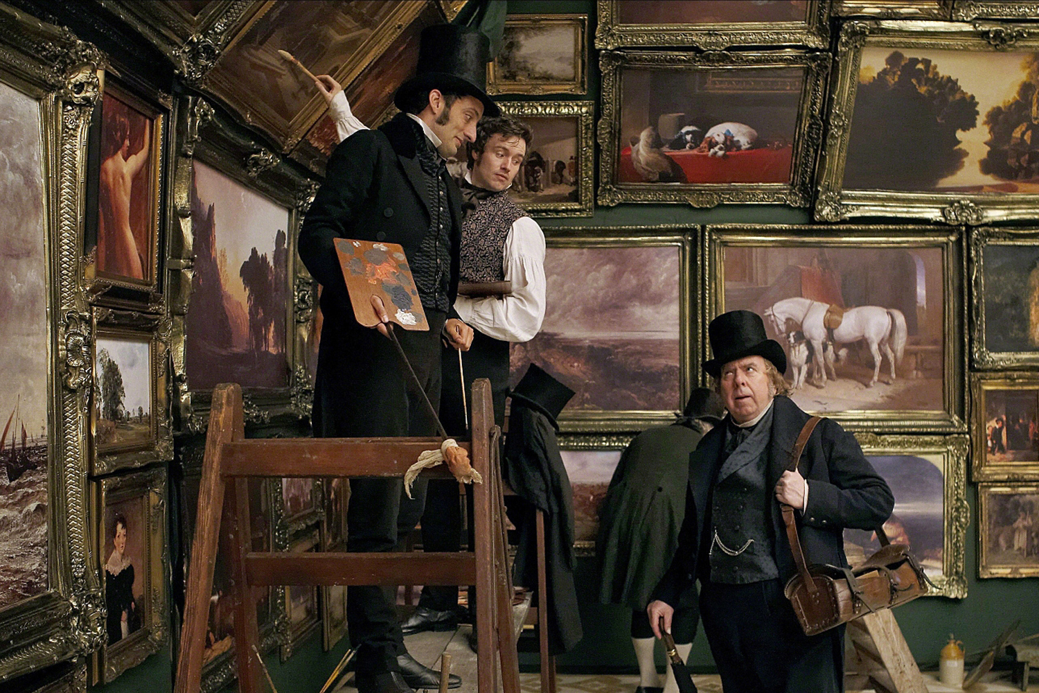 Todo esto lo muestra Leigh siempre manteniendo la atención en el relato, y quizá lo mas importante, logra que la cinta parezca un trabajo de Turner, la fotografía nos remonta al arte de Turner, pareciera que estamos viendo el trabajo del pintor, como el mismo vería su vida, o como veía el mundo a través de sus ojos, incluso tenemos varias de las pinturas mostradas en la cinta donde la fotografía se transforma en una pintura con espíritu de oleo, la banda sonora es impresionante, y el diseño de producción es excelso, con una recreación de las pinturas, de lugares, del año, todo bien logrado al igual que el vestuario y el maquillaje que nos muestra el rápido deterioro que sufrían las personas dependiendo su tipo de vida. La cinta comienza cuando Turner llega a su casa donde su padre y su ama de llaves acatan sus deseos y pedidos con tal de que siga haciendo su arte, mientras ellos preparan todo Turner va a la academia donde comparte con otros artistas, al tipo le encanta ese tipo de vida, la selección, los niveles, el que el artista esta en un punto diferente.