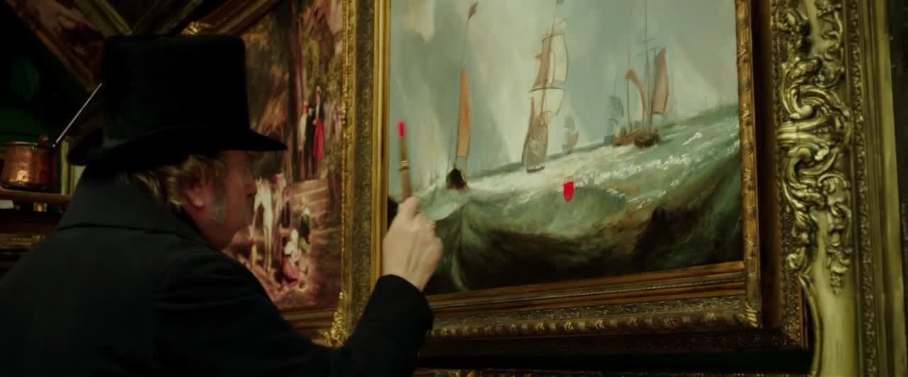 MR. TURNER (ÍDEM, REINO UNIDO - ALEMANIA - FRANCIA, 2014)Turner (Timothy Spall, perfecto) esta en la Royal Academy donde la exposición decora las paredes del lugar, y donde los artistas se halagan al mismo tiempo que tienen una gran rivalidad, ahi turner ve como una pintura al lado de la suya tiene muchísimos detalles y siguen trabajando en ella, el tipo parece enfurecerse y hace una mancha roja en su magnifica pintura en lo que parecería un arranque, un berrinche, justamente eso estan alegando los demás pintores cuando regresa y lo arregla dándole un nuevo detalle y una nueva dimensión a la pintura, eso enfurece a su adversario, en esta escena se resume el modo de ser y las actitudes del genio pintor Joseph Mallord William Turner quien no solo era un genio adelantado a su epoca y reconocido en la misma sino que su genialidad solo era equiparable a su terrible carácter, gruñón, ermitaño, excéntrico, que solo vivía para el y para su propio arte, bueno esto no es del todo real y justo, Turner respetaba a todo aquel que le pareciera una persona pensante, inteligente, culta y con talento lo que lo diferencia de la imagen de la mayoria de los genios modernos, y en realidad amaba a sus seres cercanos aunque estos no eran ni los dedos de una mano.