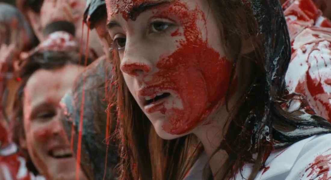VORAZ (GRAVE, FRANCIA-BÉLGICA,2016)La pequeña y lolita Justine (Garance Marillier, fantastica) es la niña de papas que apenas sabe algo del mundo y no se ha hecho de un carácter propio, ha crecido en una familia de veterinarios y estrictos veganos que la cuidan mucho pero la tienen que dejar partir a la universidad, pero como en típica universidad de primer mundo el lugar es un infierno, los novatos son tratados con desprecio y los veteranos los hacen hacer lo que ellos quieren, a pensar como desean y humillarse en todo momento, las novatadas van desde una fiesta de perdición, bañarlos con sangre de animal y comer una víscera de animal cruda, Justine no tiene nadie en quien apoyarse, ni siquiera su hermana Alexia (Ella Rumpf, muy bien) que tiene constantes cambios en su actitud con ella, lo peor es que sumado al estrés de un nuevo mundo, las presiones, las novatadas, los abusos, el estar lejos de la familia y tener un desvergonzado compañero de cuarto homosexual se le suma una agresiva reacción alergica a la carne.