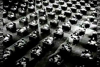 Esta famosísima escena que años después homenajearía Billy Wilder en 'El apartamento' y que nos sirve para abrir hoy la presentación de la película que os proponemos comentar, efectivamente nos sitúa de forma inigualable en la temática del filme, pero además tenemos la oportunidad de con ella desvelar parte de la magia del cine. El propio Vidor nos lo cuenta en su aclamada obra 'Un arbol es un arbol':"Una escena se rodó en la ciudad de Nueva York, a la entrada del Equitable Life Insurance Building a la hora del almuerzo. La cámara comenzaba su movimiento ascendente, y cuando la pantalla se llenaba de ventanas, logramos un encadenado imperceptible con una maqueta a escala que construimos en el estudio. Dispusimos aquella miniatura tumbada sobre el suelo, para que la cámara la recorriera horizontalmente. En la ventana clave colocamos una ampliación del fotograma de la vista interior que habíamos filmado previamente. Mientras la cámara se acercaba a la ventana, tenía lugar otro suave encadenado con el interior de la inmensa oficina. Los escritorios ocuparon un escenario entero, y el efecto se consiguió utilizando los muros y el suelo del propio escenario, sin emplear ningún set construido a propósito para la ocasión. Para que la cámara planeara hasta posarse sobre Murray, armamos un trole en una cámara montada sobre una plataforma de railes. Todavía no teníamos grúas de carreta ni brazos de grúa, pero logramos resultados idénticos a los que luego se conseguirían con ellas."