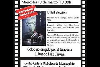 El miércoles 18 de marzo, a las 18:00 horas, en la Biblioteca de Montequinto, CINEFORUM organizado por la ONG Crecer Con Futuro donde se visionará la película ‘Difícil elección’, un filme dirigido por Chris Menges. Posteriormente habrá un COLOQUIO dirigido por el terapeuta J. Ignacio Díaz Carvajal.