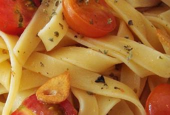 Ingredientes sin medidas (a gusto de cada cual pero equilibrados)Pasta de trigo duro tipo espaguetis o cintasTomates de huerta maduros muy frescosAjosLaurel frescoAceite de olivaOréganoSal