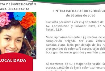 San Luis Potosí – Esta tarde, la Procuraduría General de Justicia del Estado informó que Cinthia Paola Castro Rodríguez ya había sido localizada, la cual, se encontraba desaparecida desde el pasado 4 de octubre.