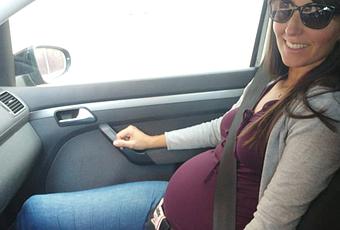 Embarazada de 6 meses con adaptador para el cinturón durante el embarazo