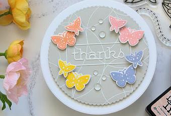 I first heat embossed the beautiful background stamp "Round and Round" on Fog gray cardstock. I cut a scalloped circle out of it and placed it on a round base card made with white cardstock. Then I stamped the butterflies using Simon Says Stamp dye inks and cut them out with its coordinating dies. These butterflies are solid stamps, so I decided to add some interest by drawing dots on them with a white gel pen.