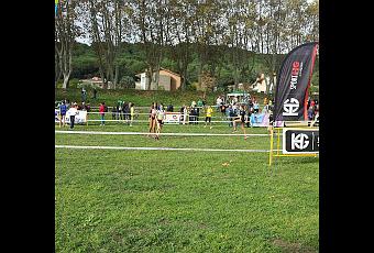 Si os fijáis a nuestra izquierda tenemos el arco de llegada. Este Cros es de 1300 m estamos juntas Mireia y yo . Dan el pistoletazo de salida y como es bajada a topeee...