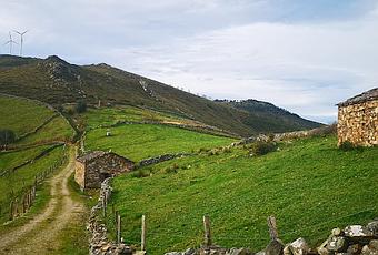 Parte baja de la antigua braña vaqueira de La Muria, una de las muchas que se desperdigan por esta zona occidental asturiana, con laberínticos y profundos valles, en los que desarrollaron su actividad los Vaqueiros de Alzada, en una dura vida seminómada de pastoreo trashumante.