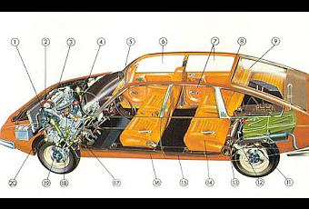 1- Alternador2- Sistema de refrigeración del motor3- Filtro de aire4- Eje delantero5- Parabrisas tonalizado en degradé6- Cristales tonalizados7- Visera antideslumbrante en las puertas traseras8- Aislamiento térmico9- Cortinas enrollables en los asientos traseros10- Impermeabilidad del portón trasero y de la cerradura11- Suspensión trasera12- Suspensión trasera13- Eje trasero14- Aislamiento térmico debajo del asiento trasero15- Impermeabilidad al polvo en la parte inferior de la puerta trasera16- Impermeabilidad al polvo en la parte inferior de la puerta delantera17- Dirección18- Suspensión del motor19- Suspensión delantera20- Preparación para el sistema de climatización Algunas de las particularidades de este modelo de Citroën: una la conocida suspensión hidroneumática que le permitía 32 posiciones diferentes. Claro que a más altura más dureza en la suspensión. Otra particularidad, que recuerdo de una visita a la Sociedad Rural, fue ver como la dirección tenía retorno automático. Es decir que una vez efectuada la maniobra de giro, si se soltaba el volante, este volvía a colocar las ruedas derechas solo.