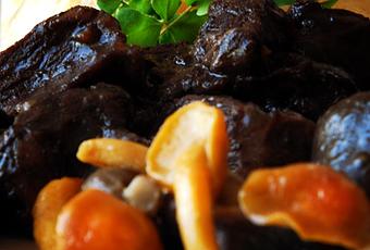 La noche anterior, troceamos la carne al gusto ydejamos macerando un mínimo de veinticuatro horas con el vino, al que habremosañadido el bouquet garni. Pasado ese tiempo, colamos el vino y retiramos lacarne. En una cazuela –preferentemente de hierro colado- añadimos el vino juntocon la carne previamente salpimentada y un vaso de agua. Hemos de reducir elvino, la cocción la haremos a fuego medio y añadimos más agua si es necesario.En el momento que la carne esté en su punto, añadimos una cucharada de azúcar ymedio vaso de agua. Dejamos cocer unos minutos y agregamos una nuez demantequilla para espesar la salsa. Listo