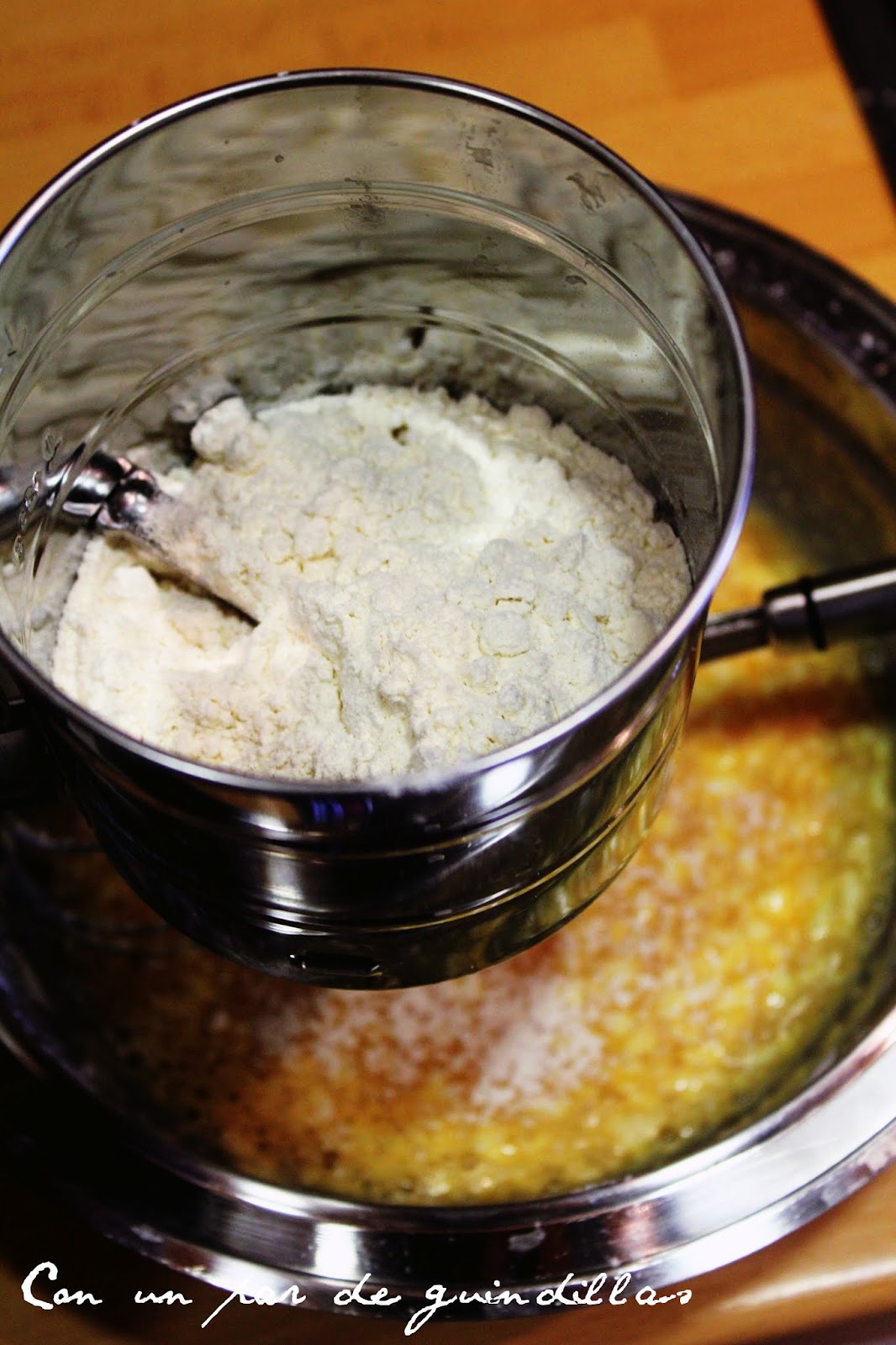 2.- Batimos los huevos en un bol y añadimos una pizca de sal. Añadimos una cucharada de mantequilla y unas gotas de agua de azahar. Mezclamos poco a poco la harina tamizada.