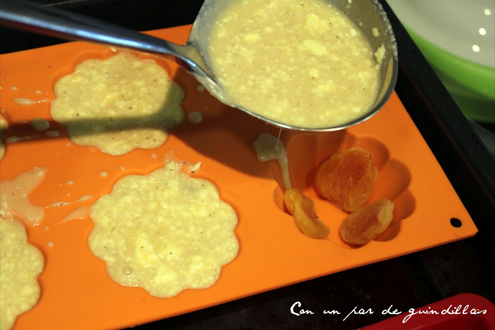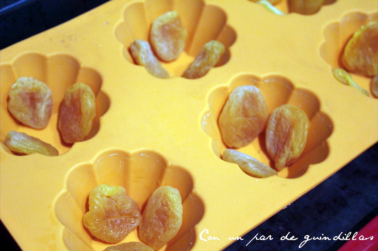 4.- Una vez que los orejones estén hidratados, los secamos y los repartimos en un molde para horno o en pequeños moldes individuales (así nos aseguramos que se repartan homogéneamente, si no quedarían todos en el fondo del bol). A continuación, vertemos la masa encima de los orejones.