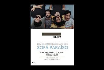 Claim nos presentará su nuevo disco en Madrid en la Sala el Sol en formato eléctrico el 16/11 con un show donde presentarán el disco y mucho más.Con este nuevo trabajo Claim acaban de demostrar que queda mucho por hacer y que llega el momento de presentarlo.Sofá Paraíso es el nuevo disco Claim; un disco que el 16/11 presentarán en directo en Madrid en la céntrica sala El Sol con un formato en directo con toda la banda y que es parte ya de su actual tour. En esta nueva visita a Madrid la banda presentará el mejor momento de su gira.