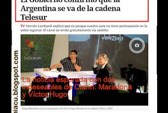 Norelys Morales Aguilera.-- En Twitter lo alertaba temparano hoy Atilio Borón: OTRO ATAQUE DEL MACRISMO A LA LIBERTAD DE EXPRESIÓN: ECHAN A TELESUR,"CANAL CHAVISTA" SEGÚN LA NACIÓN, DE ARGENTINA... @atilioboronEl ministro de Medios y Contenidos Públicos, Hernán Lombardi, confirmó este 27 de marzo a Télam la noticia, y reveló que la decisión fue adoptada a raíz de que nuestro país no tiene ninguna participación en los contenidos de la señal regional. Tampoco venía participando en su gerenciamiento, publicó la web del monopolio mediático Clarín, que como buen defensor de la pluralidad informativa torpedeó todo lo que pudo y más la avanzada Ley de Medios argentinos, y ahora sí, a jugar en la democracia del capital, que catapultó a la presidencia a Mauricio Macri.