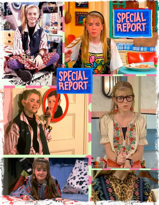 algunos problemas y dilemas desde su pieza decorada con el mismo tono del personaje (llena de cosas), los atados con su odioso hermano, algunas que otras confusiones sentimentales con su mejor amigo y algunos altercados con sus padres, una pareja bastante especial. En cada episodio nosdeslumbraba con sus looks alocados, mezclando la onda retro, vintage, moderna, vanguardista, rockera, pop, militar... la verdad es que no sé cómo explicarlo, pero en ella se veía bien.SCANER LOOK: Pañuelos en el cabello, sombreros vintage, alocados moños y cintillos eran uno de los accesorios más propios de Clarissa. Fanática de las pulseras, pañuelos y variados anillos, piezas responsables de los detalles en sus looks. Maxi camisetas sobre poleras a rayas, estampadas o de puntos o amarradas a la cintura. Una de las prendas más comunes de sus outfits eran los boleros antiguos en conjunto con calzas largas y cortas que eran utilizadas bajo shorts o vestidos. Sin duda, un popurrí bastante nada que ver, pero en ella lucía fácil de llevar, aunque a simple vista parece que fuese de lo más desequilibrado y sobre dimensionado, a nivel de color, tallas, texturas y tendencia, ¡una mezcla entre los 70´s, 80´s y 90´s! El fiel reflejo (según yo) de lo perdida que es la pre-adolescencia en la que estábamos inmersos.¿Quieres lograr el look de Clarissa?Agarra todo lo divertidoque tengas en tu closet, tíralo todo sobre tu cama y mezcla como quieras, diviértete y si te atreves, envíanos una foto. Espero les haya gustado, les dejo este "colach".