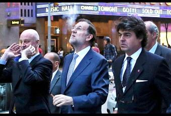 Rajoy, acompañado de su séquito, fumándose un puro ayer en NY