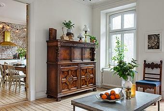 La vivienda que hoy os presento es una de esas excepciones que confirman la regla. Está en Goteborg, en el sur de Suecia, y es un magnífico ejemplo de eclecticismo bien ejecutado. En la decoración de los espacios se ha optado por mezclar diversos estilos, desde el más clásico de la mayoría de las piezas de mobilairio (vintage en su mayoría), al industrial, presente en algunas de las paredes de ladrillo visto, sin olvidar el minimalismo de la cocina. Todo ello aderezado con una buena muestra de textiles (especialmente en las alfombras) de inspiración étnica.