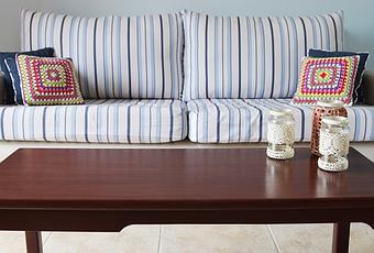 Me gusta mucho como queda con las paredes celestes y el rayado en tonos azules del sillón! No hay que tenerle miedo a los colores opuestos!