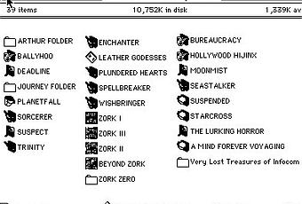 Arthur: The Quest for ExcaliburBallyhooBeyond ZorkBorder ZoneBureaucracyCutthroatsDeadlineEnchanterHollywood HijinxInfidelJourneyLeather Goddesses of PhobosThe Lurking HorrorA Mind Forever VoyagingMoonmistNord and Bert Couldn't Make Head or Tail of ItPlanetfallPlundered HeartsSeastalkerSherlock: The Riddle of the Crown JewelsSorcererSpellbreakerStarcrossStationfallSuspectSuspendedTrinityWishbringerThe WitnessZork IZork IIZork IIIZork ZeroA Change in the WeatherThe Magic ToyshopThe Mind ElectricThe One That Got AwayToonesiaUncle Zebulon's Will