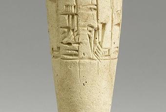 Esta pieza está realizada en arcilla, lo más común, pero también se han encontrado de cobre o bronce. En la inscripción aparece el nombre de Gudea de Lagash, actual Telloh (Irak), uno de los regentes más importares del resurgimiento sumerio. Esta fechada ca. 2100 ANE.