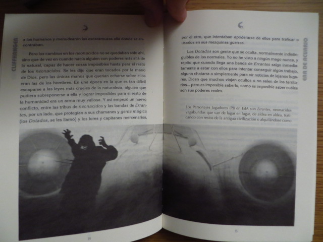 El otro ejemplar, Era de Acuario, es justamente lo contrario a Saqueadores de Tumbas. La ambientación podría resumirse en un metro 2033 + Fallout + Summerland + La Carretera. En un futuro, cercano o no, la humanidad sobrevive más o menos tras los acontecimientos de La Noche del Dragón donde todo quedó hecho mierda. Pero, como decían en Parque Jurásico, la vida se abre paso y con ese panorama comienzan a surgir nuevas razas tanto de animales como de humanos. Los neonacidos, humanos con capacidades especiales que les ayudan a sobrevivir en este mundo yermo y contaminado pero que, a su vez, les acarrean algunas taras y el desprecio de los humanos normales.El autor, Juan Cuadrado, nos propone una ambientación abierta que toca muy de cerca a Summerland (personajes "repudiados" que van de asentamiento en asentamiento) pero que el propio texto del libro delimita a un lugar llamado Malpaís, que a mí no me ha quedado muy claro si es grande, pequeño, una ciudad o algo mayor. Cada capítulo está narrado en primera persona contando algún suceso relacionado con el tema del capítulo para, cuando ha terminado el monólogo, explicar el funcionamiento en términos de juego. Si es una buena forma de explicarlo o no queda supeditado a cada lector. Personalmente no me gusta esta forma de presentar el libro, mezclando ambientación y sistema como si fuera un único todo. Ya lo he dicho en otras ocasiones, y lo vuelvo a decir: primero dame la ambientación y luego el sistema.Respecto al resto de libro, la encuadernación e interiores son idénticos al resto de la línea. Por el contrario, las imágenes que ilustran cada apartado son un tanto confusas y no las encuentro mucho sentido sobre lo que quieren explicar o decir.Colgando del acantilado