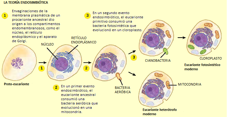 En nuestro intestino tenemos unas bacterias que producen vitamina K a partir de lo que nosotros ingerimos. La vitamina K nos es imposible tomarla de los alimentos y tampoco somos capaces de producirla, por lo que toda la vitamina K que requiere nuestro organismo procede de estas bacterias que la producen; a cambio, nuestros intestinos les dan protección y evitan que mueran deshidratadas. A este proceso se le conoce como endosimbiosis, un tipo de simbiosis donde uno de los beneficiarios vive dentro del otro. Si bien suena poco usual, las relaciones endosimbióticas son muy comunes en la naturaleza.Entre las mitocondrias y los cloroplastos existen demasiadas semejanzas: ambos organelos poseen dos membranas, poseen sus propios ribosomas y su propio ADN. Al analizar las secuencias genéticas del material genético tanto de la mitocondria como del cloroplasto se encontró que compartían un origen bacteriano. Esto supuso que en algún momento, células eucariontes primitivas establecieron relaciones endosimbióticas al ingerir bacterias tanto aeróbicas como autotróficas (cianobacterias) sin destruirlas. Con el paso de millones de años de evolución estas bacterias ingeridas se empezaron a especializar cada vez más en sus funciones, de modo que las bacterias aeróbicas se convirtieron en las actuales mitocondrias, y las bacterias autotróficas en los cloroplastos.Dado que casi todos los eucariontes poseen mitocondrias, pero solamente las algas y las plantas tienen cloroplastos, sabemos que la endosimbiosis debió ocurrir al menos dos veces en tiempos diferentes: una primera vez con las mitocondrias y una segunda vez con los cloroplastos.