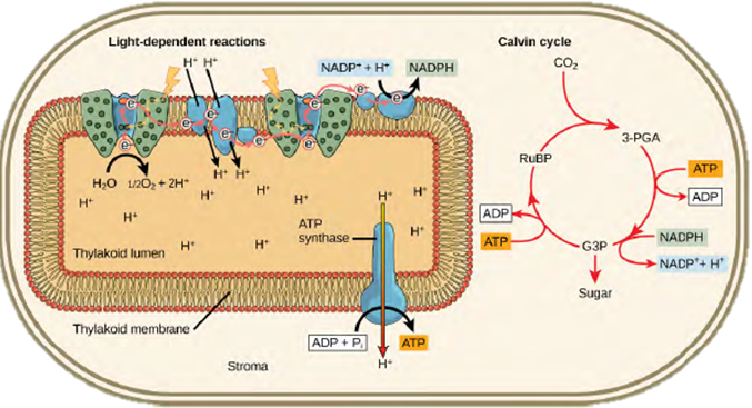 Los cloroplastos se componen de dos membranas, una membrana externa y una membrana interna, y en la interna poseen todas las proteínas que tienen las bacterias para transportar nutrientes. Dentro del cloroplasto se encuentra un espacio denominado estroma, dentro del cual se encuentran otras estructuras membranosas llamadas tilacoides. Los tilacoides son pliegues de la membrana interna del cloroplasto, pero a diferencia de la membrana interna, la membrana tilacoidal tiene todos los complejos proteínicos de la membrana requeridos para la fotosíntesis (fotosistemas, quinonas, citocromos y complejos bc). Dentro de los tilacoides existe un segundo espacio que recibe el nombre de espacio tilacoidal. En los tilacoides se lleva a cabo el proceso de captura de la luz y el transporte de electrones (fotofosforilación); cuando se tienen varios tilacoides apilados uno sobre el otro se forma lo que se conoce como grana.En el estroma de los cloroplastos se sintetiza almidón y es donde ocurre la fijación del carbono. El almidón se acumula en pequeños corpúsculos debido a que es insoluble en agua y forma gránulos de almidón que se conocen como amiloplastos. Una parte de los azúcares no se convierte en almidón sino que se libera hacia el citosol para que se produzca sacarosa.Así pues, la fotosíntesis tiene la siguiente distribución espacial:1) La fotofosforilación ocurre en las memebranas tilacoidales, de modo que es aquí donde se producen el ATP y el NADPH.2) En el espacio tilacoidal se almacenan todos los protones que son bombeados hacia el estroma y de regreso para producir ATP.3) En el estroma se lleva a cabo la fijación del carbono a través del ciclo de Calvin y la síntesis de almidón. Es en este espacio donde se crean los amiloplastos.4) Las membranas interna y externa comunican al cloroplasto con el resto de la célula, introduciendo los materiales requeridos para la fotosíntesis y expulsando azúcares.5) En el citoplasma se produce la sacarosa. Este azúcar es el que se distribuye al resto de la planta en forma de savia.Organización de la fotosíntesis dentro del cloroplasto. Las reacciones dependientes de la luz se desarrollan en el tilacoide de los cloroplastos, mientras que la fijación del carbono (ciclo de Calvin) ocurre en el estroma. Open Biology.