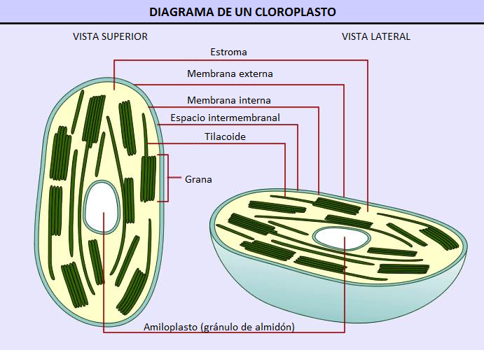 Diagrama de un corte de un cloroplasto visto desde arriba y desde un lado. Se muestra el amiloplasto en posición central, si bien esto puede variar, además de que para simplificar el diagrama solamente se ha colocado uno. Esta sería también la estructura general de una cianobacteria. El ADN se encuentra en su propio cromosoma dentro del cloroplasto (no se muestra).