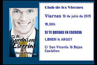 ¿Eres de Castelló, estás de vacaciones allí? Este viernes tenemos Club de Lectura de SI TE QUEDAS EN ESCOCIA en la Librería Argot.Lo pasaremos muy bien y habrá regalitos para todos los asistentes.Recuerda:Club de los Viernes10 de julio18.00 hLibrería ArgotC/ San Vicente, 16 BajosCastellón