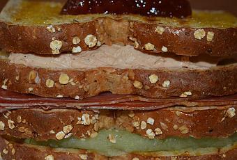 Montamos los sándwiches de la siguiente manera: Rebanada de pan, puré de hinojo, rebanada de pan, jamón serrano, rebanada de pan, una capa de 1/2 centímetros de foie gras y rebanada de pan. Para completar el sándwich yo he adornado con una cucharada de mermelada de tomate con una ramita de hinojo fresco, quedando listos para servir.