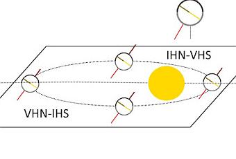 En el dibujo se puede observar el plano que dividirían el planeta en dos semiesferas, donde las líneas más claras están por debajo del plano y las más oscuras sobre él. La línea amarilla sería el ecuador y la roja el eje de rotación. Cuando es verano en el hemisferio norte (VHN) es invierno en el sur (IHS), ocurriendo lo mismo con la primavera y el otoño (no reflejado en dibujo).