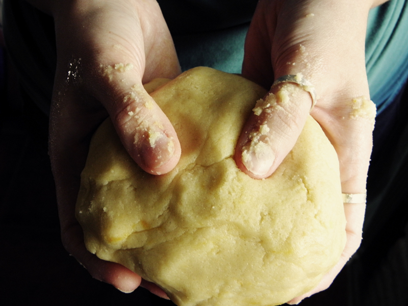 Echamos la harina junto con el azúcar,la ralladura de naranja,el huevo y la mantequilla blanda en un bol y amasamos con las manos hasta obtenber una masa consistente.