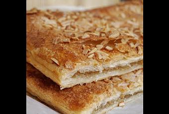 Ingredientes 2 láminas de hojaldre1 lata de cabello de ángel1 huevo100 gr. de almendras laminadasAzúcar