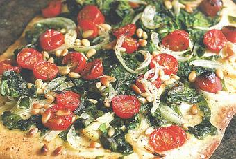 Vuelve a sacarla del horno, añade el sofrito de espinacas, espolvorea el queso y dispón sobre el conjunto los medios tomates formando la composición que buenamente se te ocurra. Añade un chorrete de aceite de oliva.