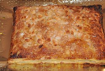 Pintar con huevo batido. Espolvorear con las almendras y con azúcar.