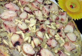 Colocamos las ruedas de pulpo por toda la superficie, espolvoreamos con un poco de queso parmesano rallado (opcional) y repartimos los piñones. Horneamos 25 minutos.