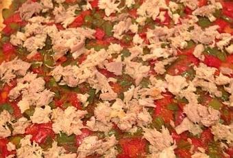 Una vez horneada le agregamos el atún por encima y la llevamos directamente a la mesa y a comerr
